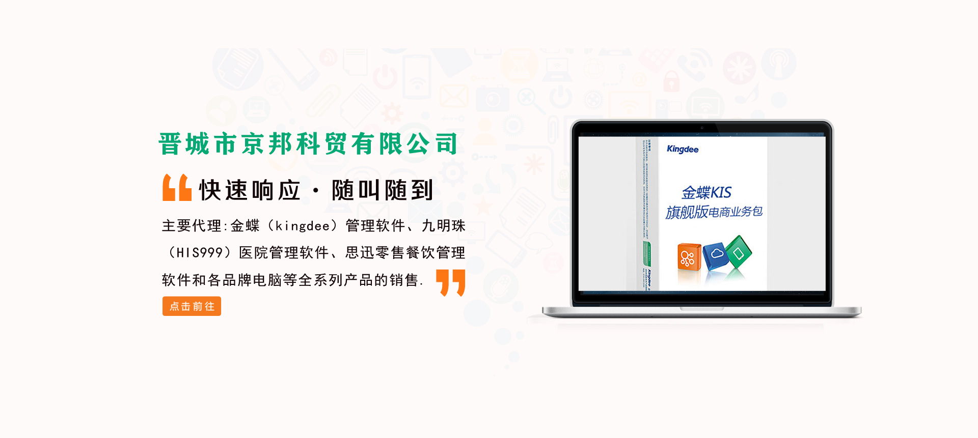晉城市京邦科貿(mào)有限公司成立于2006年,是經(jīng)晉城市工商行政管理局登記注冊(cè),主要從事軟件銷(xiāo)售、電腦銷(xiāo)售和企業(yè)管理咨詢等相關(guān)業(yè)務(wù),是金蝶軟件(中國(guó))有限公司、深圳九明珠信息科技有限公司、深圳萬(wàn)國(guó)思迅軟件有限公司在晉城地區(qū)高級(jí)代理商,主要代理金蝶(kingdee)管理軟件、九明珠(HIS999)醫(yī)院管理軟件、思迅零售餐飲管理軟件和各品牌電腦等全系列產(chǎn)品的銷(xiāo)售。